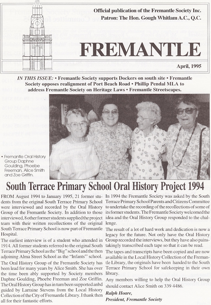The Fremantle Society oral history group’s last major project was the South Terrace Primary School Oral History Project, which ran from August 1994 to January 1995. The group had dwindled by now to half its former size, with only Alice Smith, Daphne Goulding, Zoe Griffin and Phoebe Freeman remaining, with Larraine still taking an advisory role. They interviewed twenty-one former students, while eight other students produced written recollections of the original school, which is now part of Fremantle Hospital. A front-page story in Fremantle when the project was completed noted that ‘All former students referred to the original South Terrace Primary School as the “Big” school, and the then adjoining Alma Street School as the “Infants” school.’