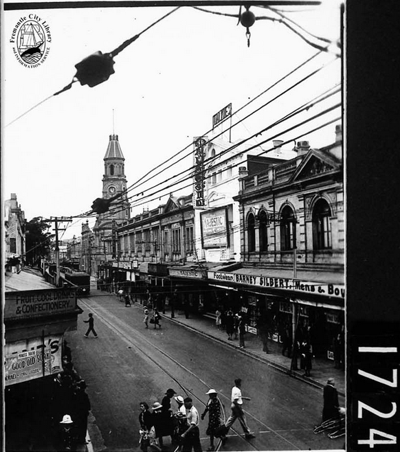 The Majestic Theatre (cinema) High St Fremantle, right of centre, with the white facade. The sign on the top of the building says TALKIES, so this would be the 1930s - apparently 1937. The cinema auditorium is still (2015) inside: it's completely empty, unused, without a ceiling. The balconies which are dimly visible in the photograph (under the large poster) can still be seen from the street. The ironwork displays the initials MT. Image from the Fremantle City Library Local History Collection.