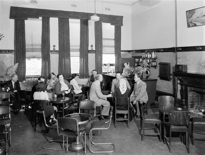 SLWA photo 243035PD, 1952. The 'Ladies Lounge'? There's at least one lady at each table. Posed? (The barmaid is smiling at the cameraman, but everyone else is ignoring him.) Not a great selection of alcoholic beverages on show - though there are more through the doorway in the corner. Did the beer come out of that tap on the wall?