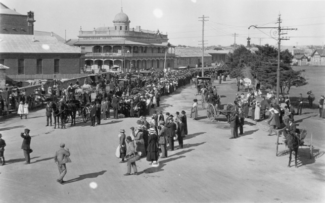 The Esplanade Hotel 9 May 1919 on the occasion of the funeral of Tom Edwards, working class martyr. The cortege was departing the Trades Hall building in Collie St, opposite the Hotel.