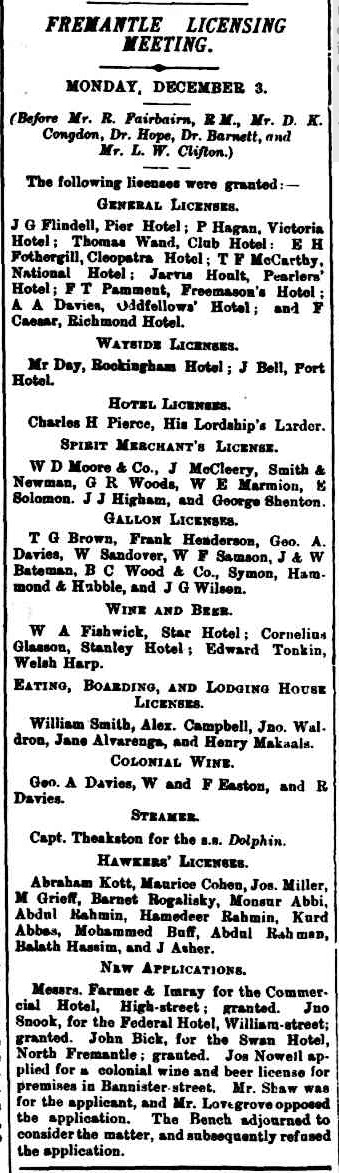 Messrs. Farmer & Imray for the Commercial Hotel, High-street; granted. Jno Snook, for the Federal Hotel, William-street; granted. John Bick, for the Swan Hotel, North Fremantle; granted. Jos Nowell applied for colonial wine and beer license for premises in Bannister street. Mr. Shaw was for the applicant, and Mr. Lovegrove opposed the application. The Bench adjourned to consider the matter, and subsequently refused the application.