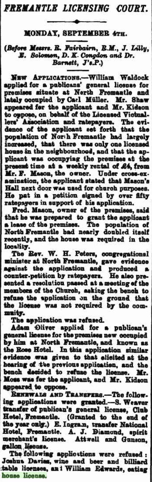 New Applications.-William Waldock applied for a publicans' general license for premises situate at North Fremantle and lately occupied by Carl Müller. Mr. Shaw appeared for the applicant and Mr. Kidson to oppose, on behalf of the Licensed Victuallers' Association and ratepayers. The evidence of the applicant set forth that the population of North Fremantle had largely increased, that there was only one licensed house in the neighbourhood, and that the applicant was occupying the premises at the present time at a weekly rental of £4, from Mr. F. Mason, the owner. Under cross-examination, the applicant stated that Mason's Hall next door was used for church purposes. He put in a petition signed by over fifty ratepayers in support of his application.