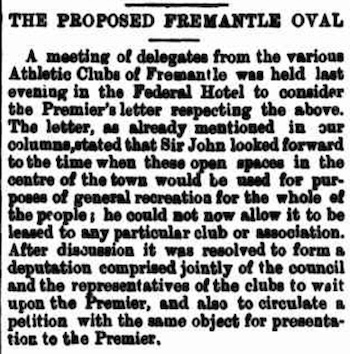 A meeting of delegates from the various Athletic Clubs of Fremantle was held last evening in the Federal Hotel to consider the Premier's letter respecting the above. The letter, as already mentioned in our columns, stated that Sir John looked forward to the time when these open spaces in the centre of the town would be used for purposes of general recreation for the whole of the people; he could not now allow it to be leased to any particular club or association. After discussion it was resolved to form a deputation comprised jointly of the council and the representatives of the clubs to wait upon the Premier, and also to circulate a petition with the same object for presentation to the Premier. Inquirer, 9 June 1893: 13.