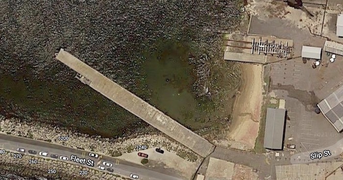 Google Maps contemporary GPS photo of the bay between two disused jetties.